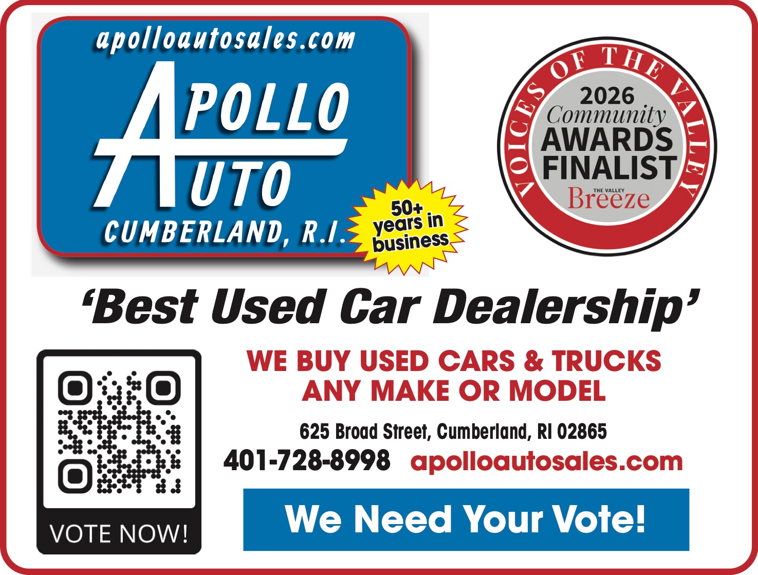 401-728-8998 apolloautosales.com We Need Your Vote!