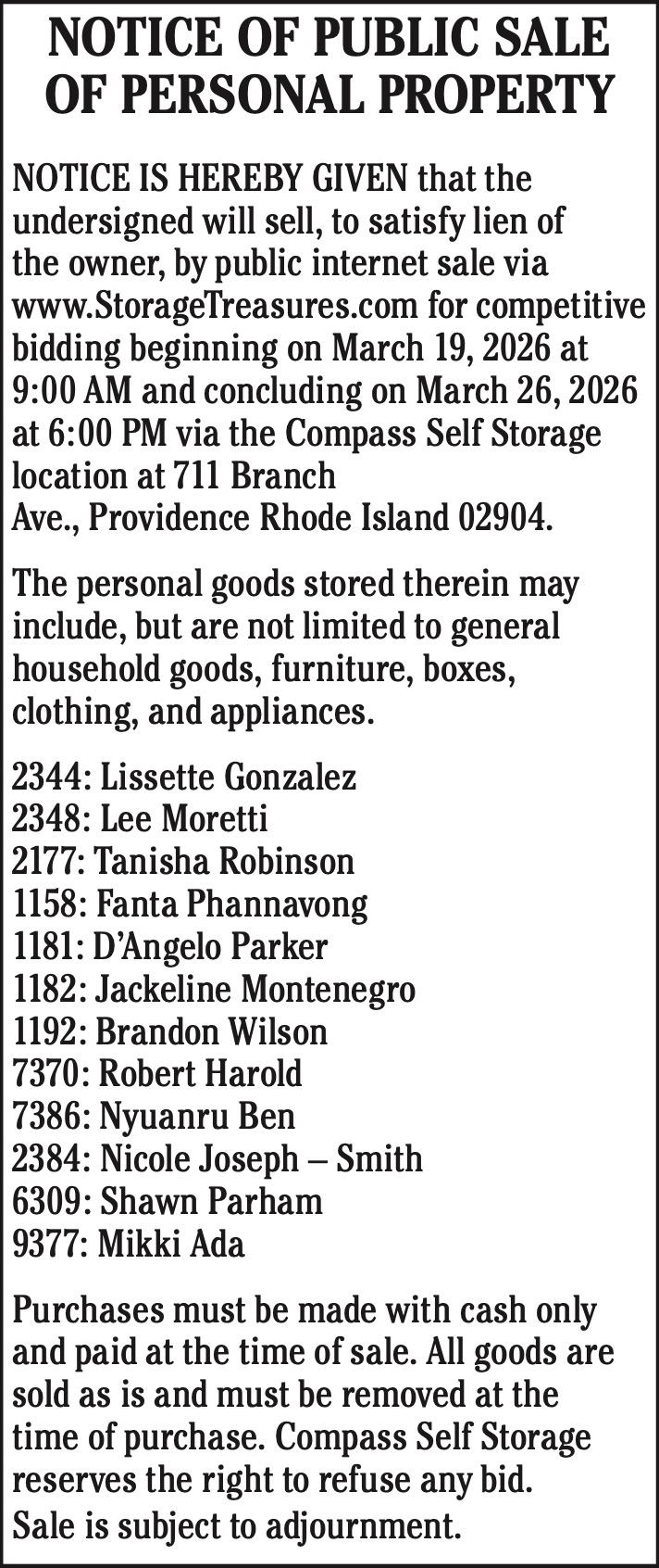the owner, by public internet sale via www.StorageTreasures.com for competitive bidding beginning on March 19, 2026 at 9:00 AM and concluding on March 26, 2026 at 6:00 PM via the Compass Self Storage location at 711 Branch