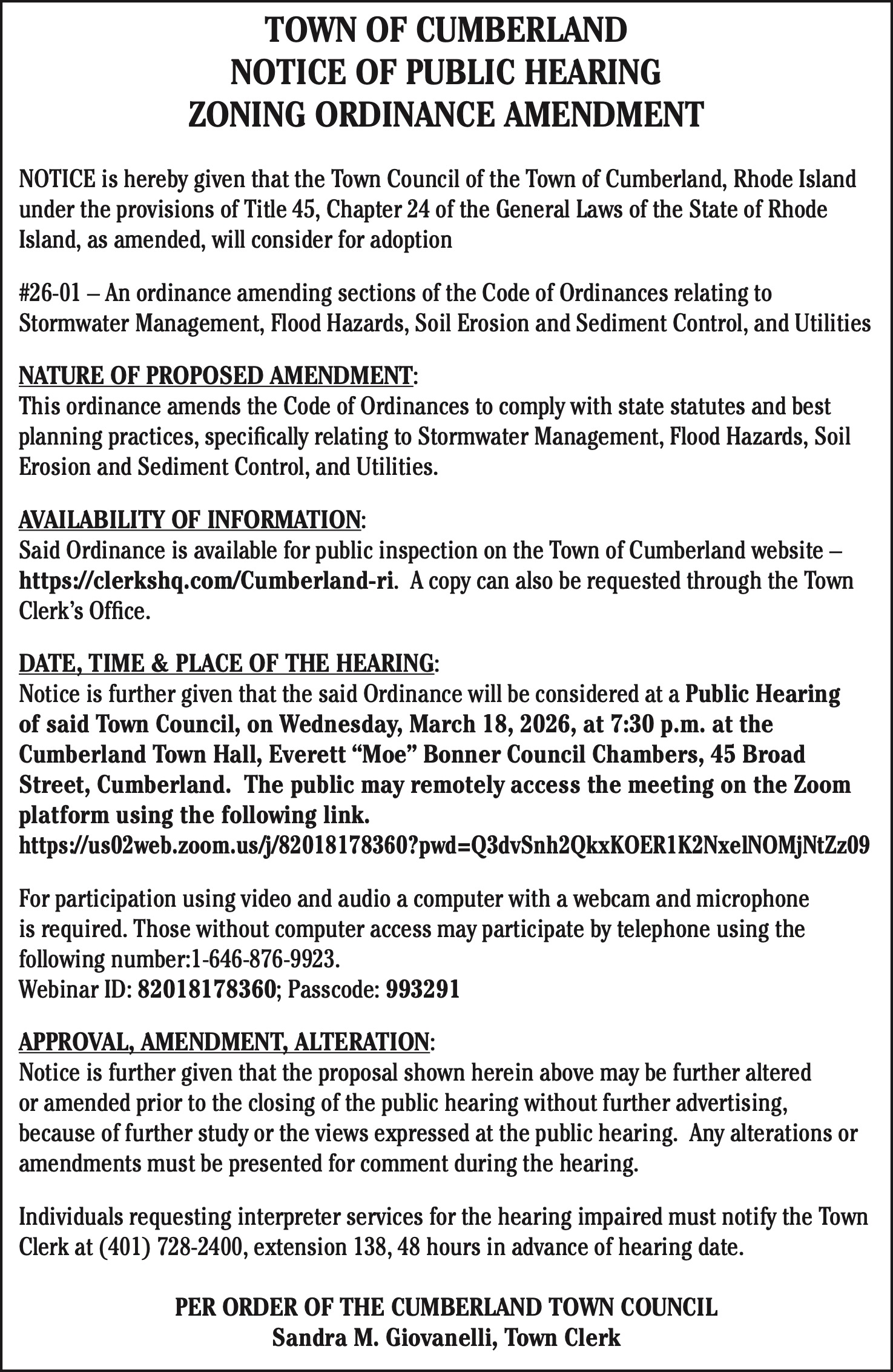 of said Town Council, on Wednesday, March 18, 2026, at 7:30 p.m. at the Cumberland Town Hall, Everett Moe Bonner Council Chambers, 45 Broad Street, Cumberland. The public may remotely access the meeting on the Zoom platform using the following link. https://us02web.zoom.us/j/82018178360?pwd=Q3dvSnh2QkxKOER1K2NxelNOMjNtZz09