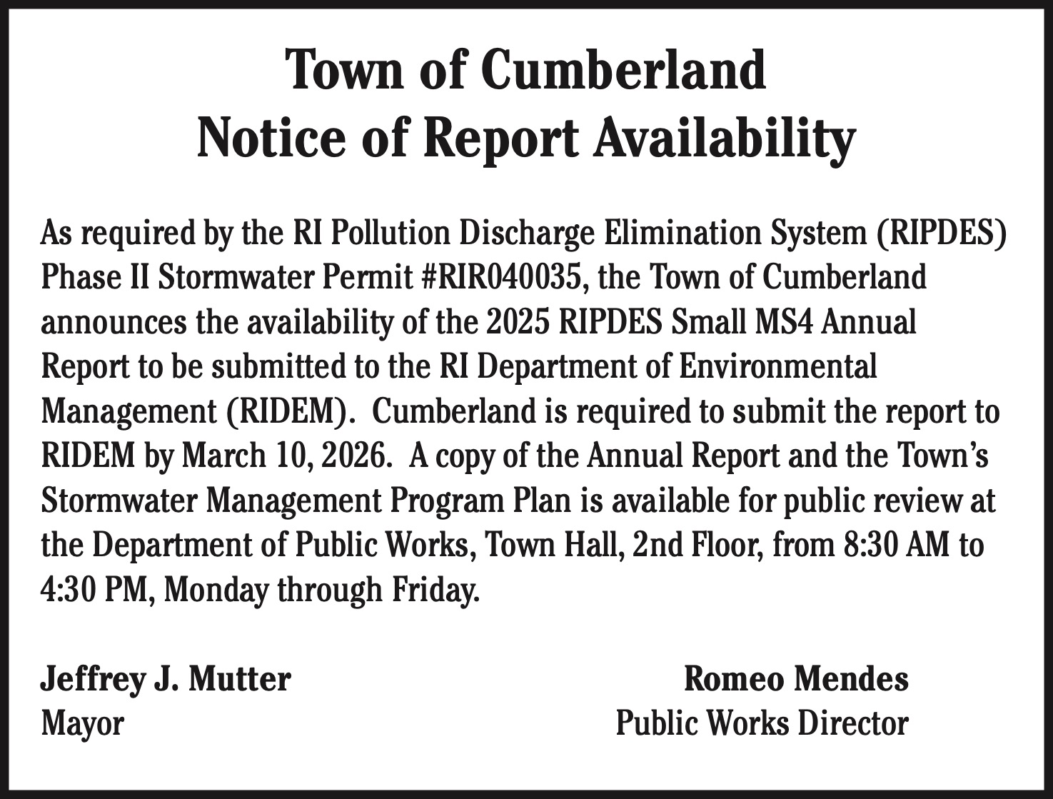 As required by the RI Pollution Discharge Elimination System (RIPDES) Phase II Stormwater Permit #RIR040035, the Town of Cumberland announces the availability of the 2025 RIPDES Small MS4 Annual Report to be submitted to the RI Department of Environmental Management (RIDEM). Cumberland is required to submit the report to RIDEM by March 10, 2026. A copy of the Annual Report and the Towns Stormwater Management Program Plan is available for public review at the Department of Public Works, Town Hall, 2nd Floor, from 8:30 AM to 4:30 PM, Monday through Friday.