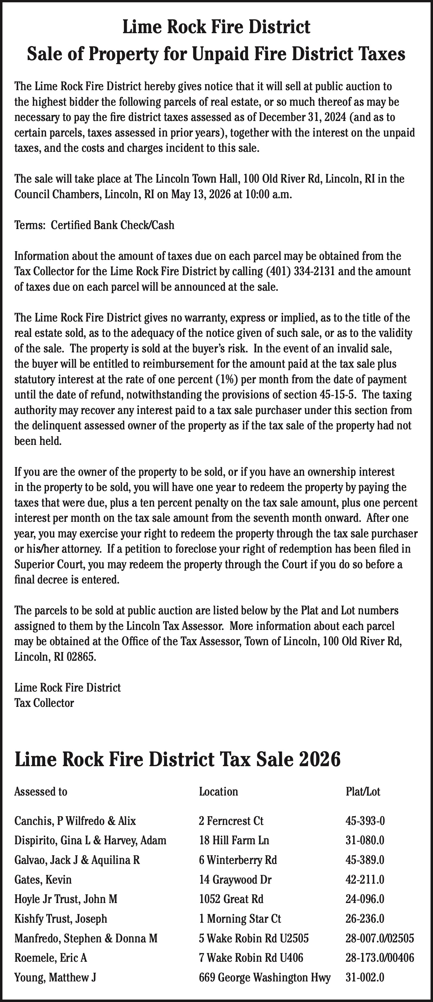 Information about the amount of taxes due on each parcel may be obtained from the Tax Collector for the Lime Rock Fire District by calling (401) 334-2131 and the amount of taxes due on each parcel will be announced at the sale.