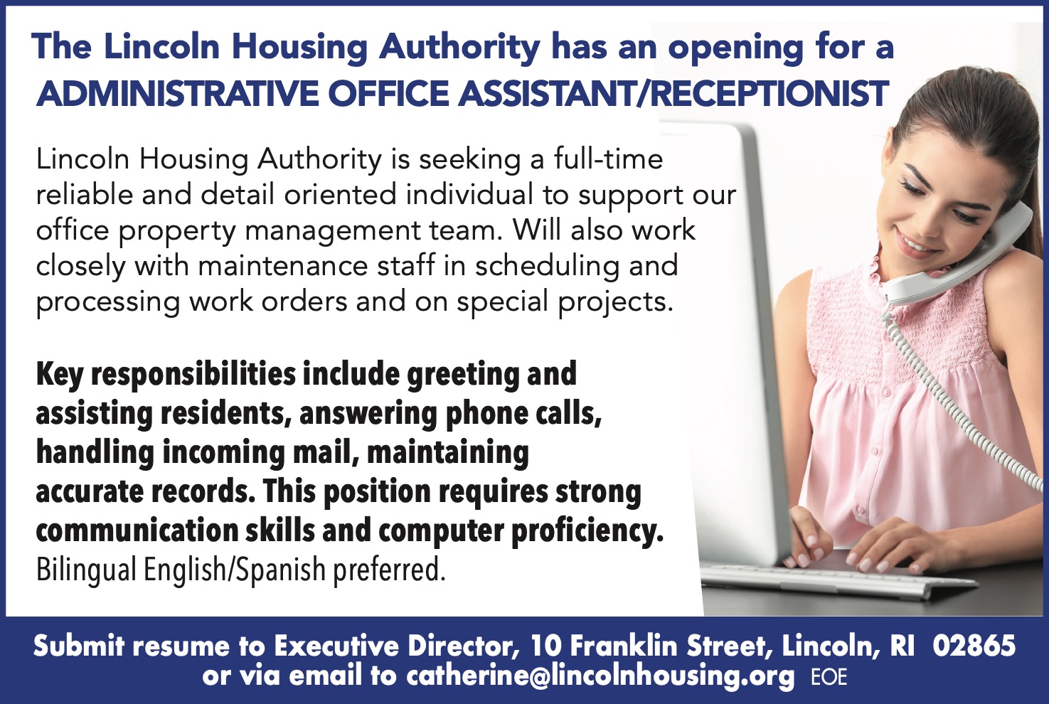 Ad textLincoln Housing Authority The Lincoln Housing Authority has an opening for a ADMINISTRATIVE OFFICE ASSISTANT/RECEPTIONIST