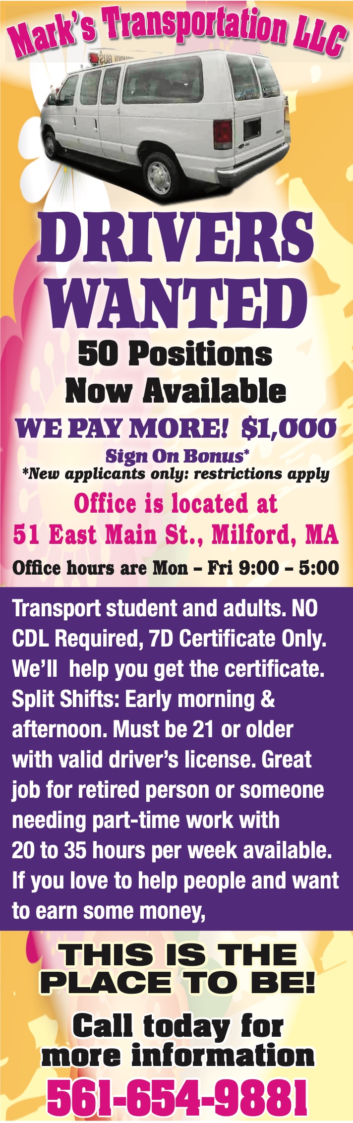 Transport student and adults. NO CDL Required, 7D Certificate Only. Well help you get the certificate. Split Shifts: Early morning & afternoon. Must be 21 or older with valid drivers license. Great job for retired person or someone needing part-time work with