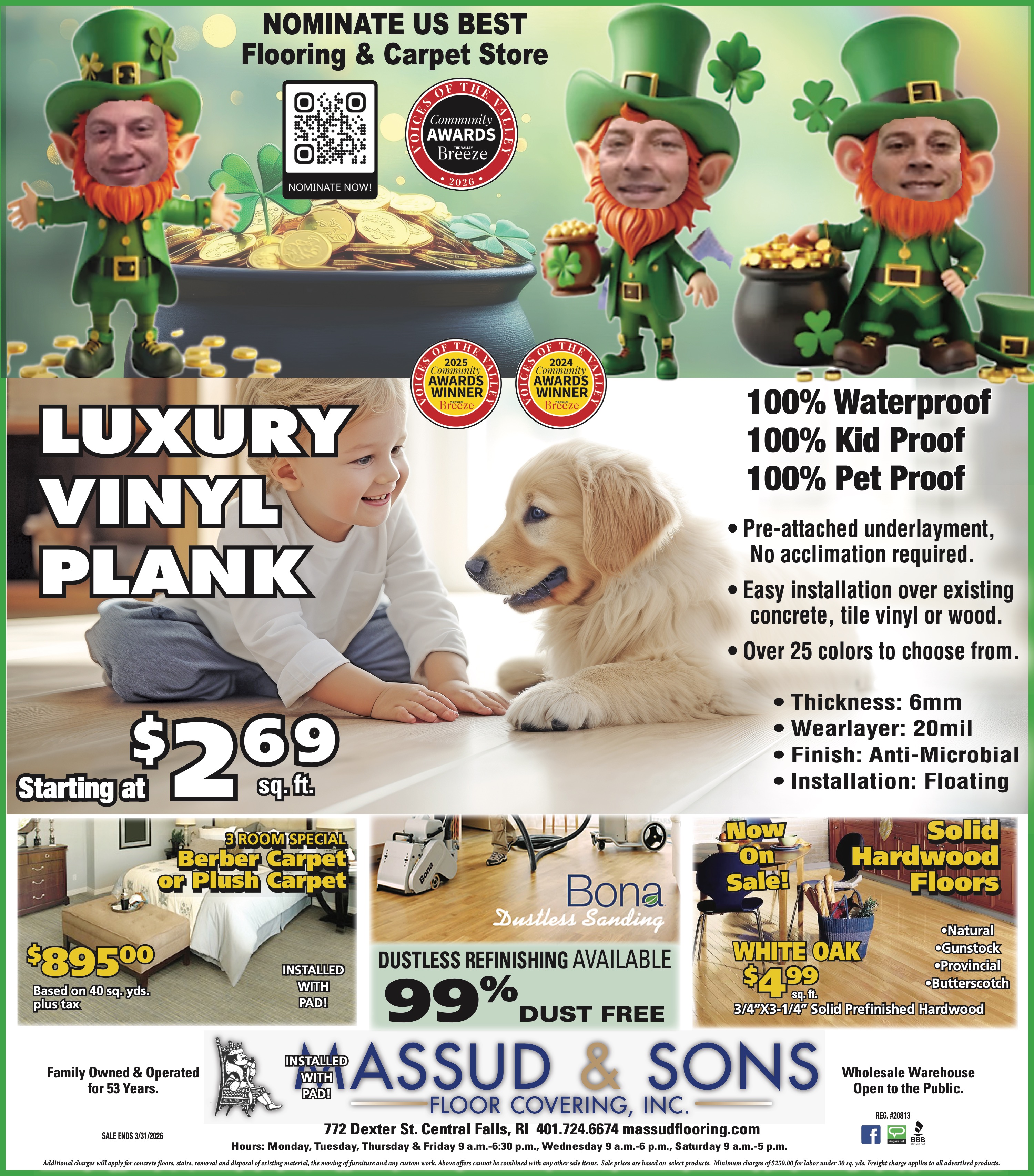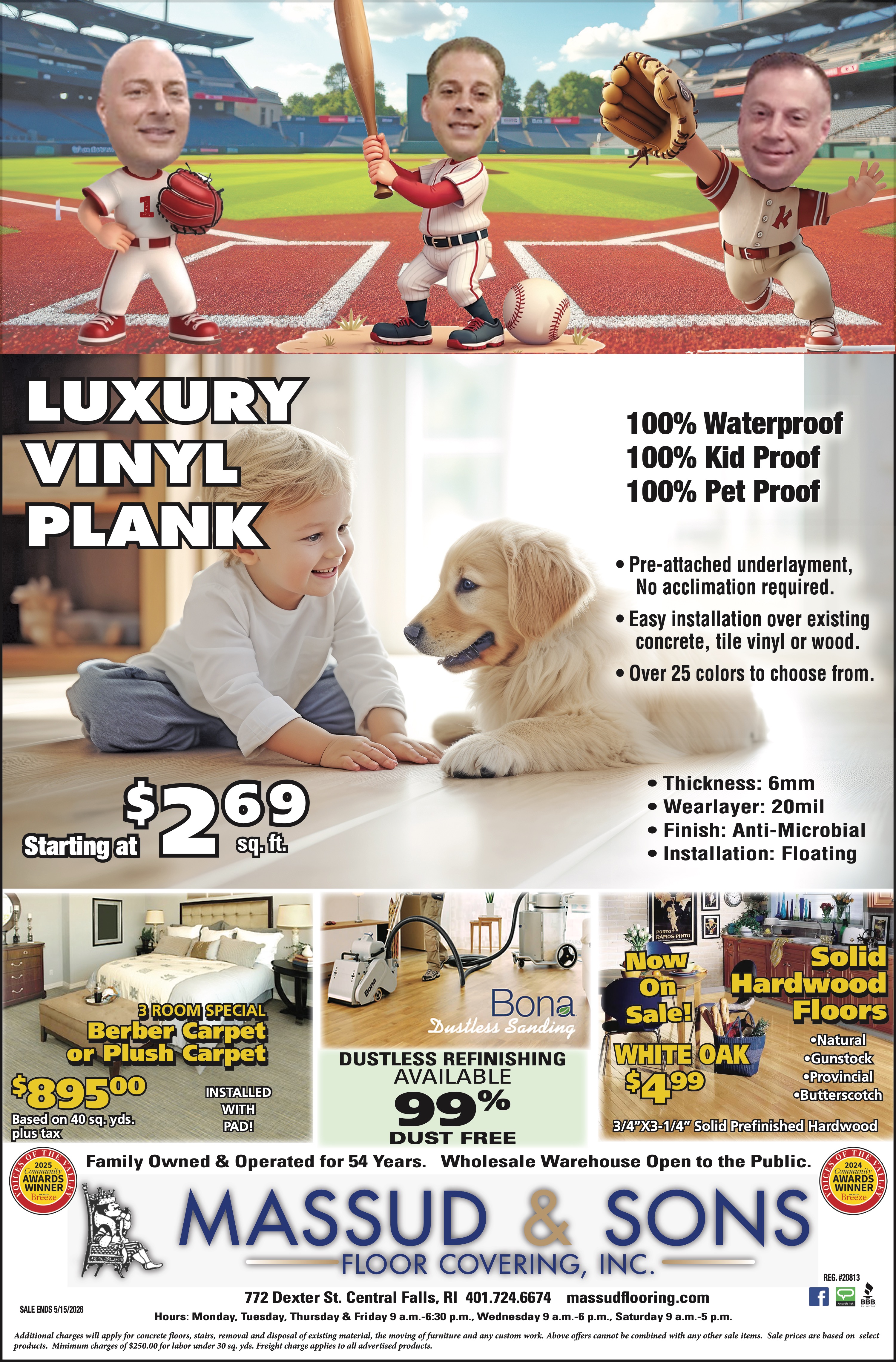 772 Dexter St. Central Falls, RI 401.724.6674 massudflooring.com Hours: Monday, Tuesday, Thursday & Friday 9 a.m.-6:30 p.m., Wednesday 9 a.m.-6 p.m., Saturday 9 a.m.-5 p.m.