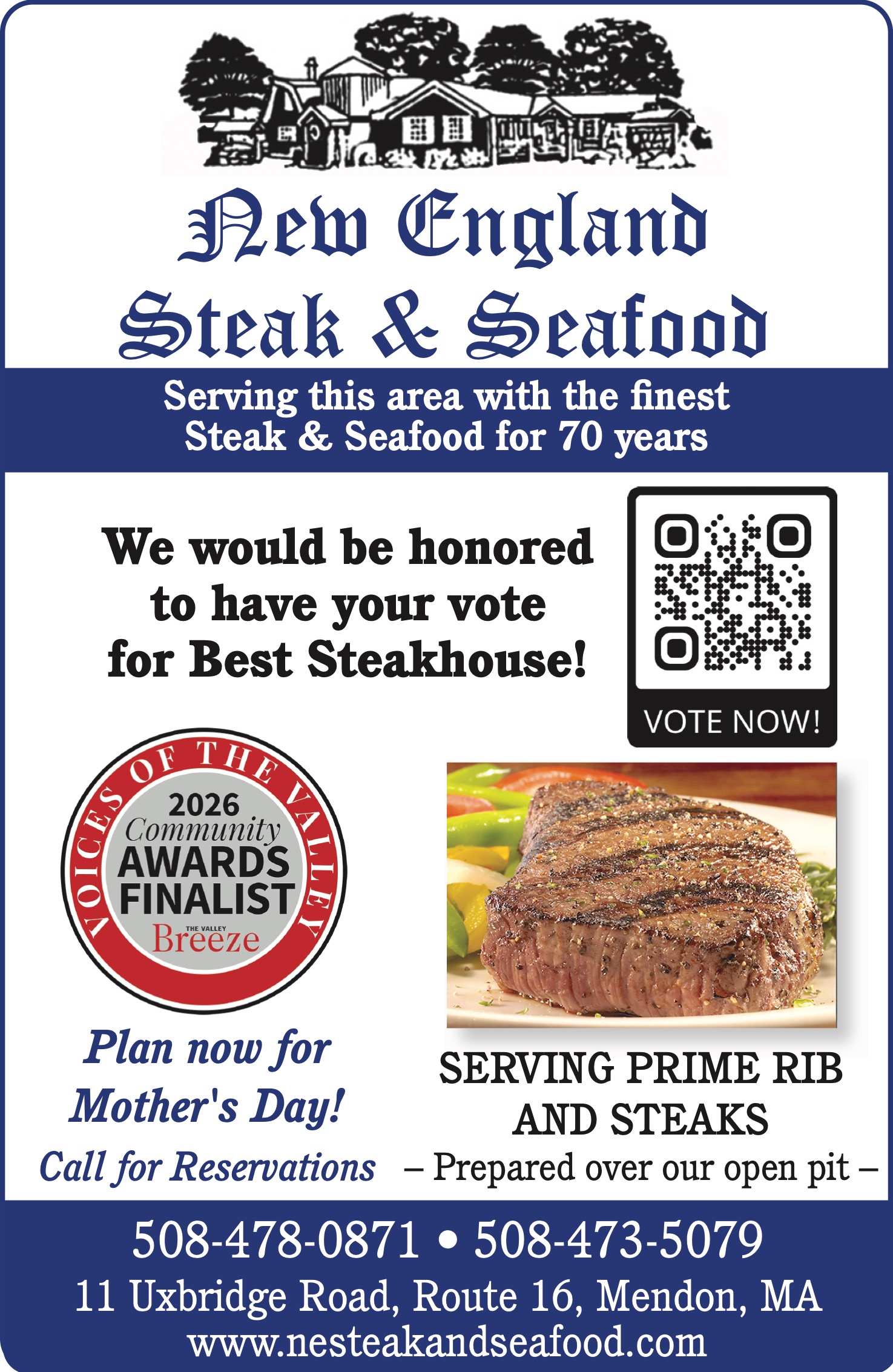 11 Uxbridge Road, Route 16, Mendon, MA www.nesteakandseafood.com