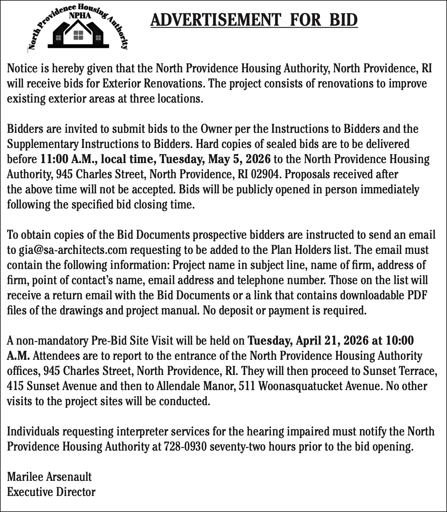 Individuals requesting interpreter services for the hearing impaired must notify the North Providence Housing Authority at 728-0930 seventy-two hours prior to the bid opening.