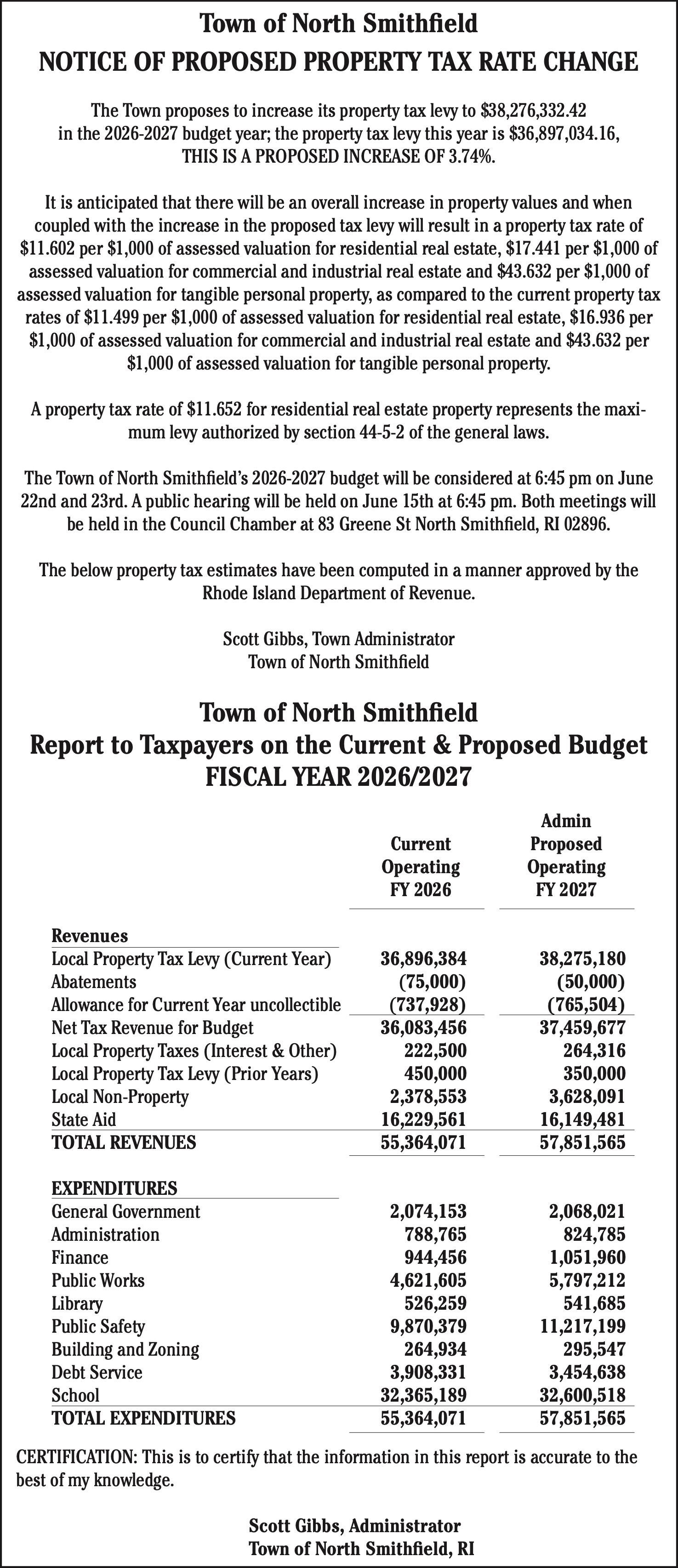 The Town of North Smithfields 2026-2027 budget will be considered at 6:45 pm on June 22nd and 23rd. A public hearing will be held on June 15th at 6:45 pm. Both meetings will be held in the Council Chamber at 83 Greene St North Smithfield, RI 02896.