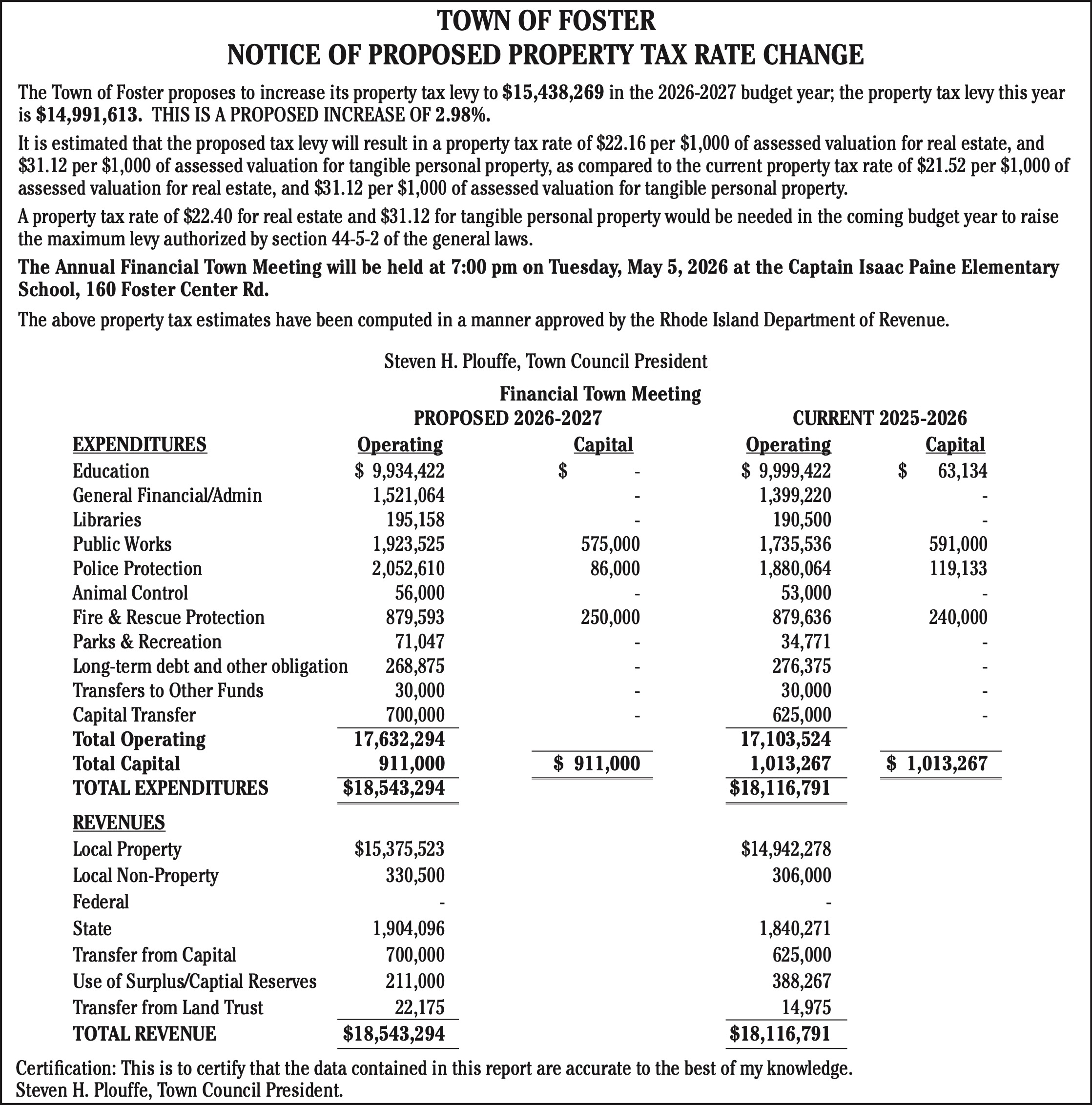The Town of Foster proposes to increase its property tax levy to $15,438,269 in the 2026-2027 budget year; the property tax levy this year is $14,991,613. THIS IS A PROPOSED INCREASE OF 2.98%.