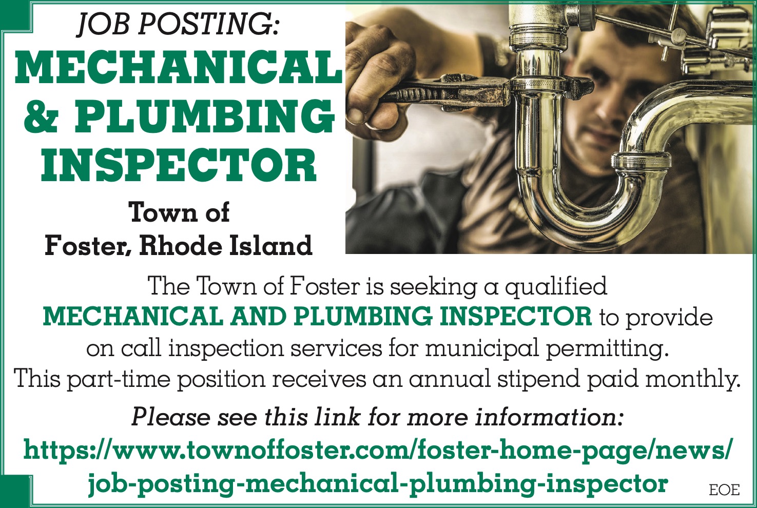 The Town of Foster is seeking a qualified MECHANICAL AND PLUMBING INSPECTOR to provide on call inspection services for municipal permitting.