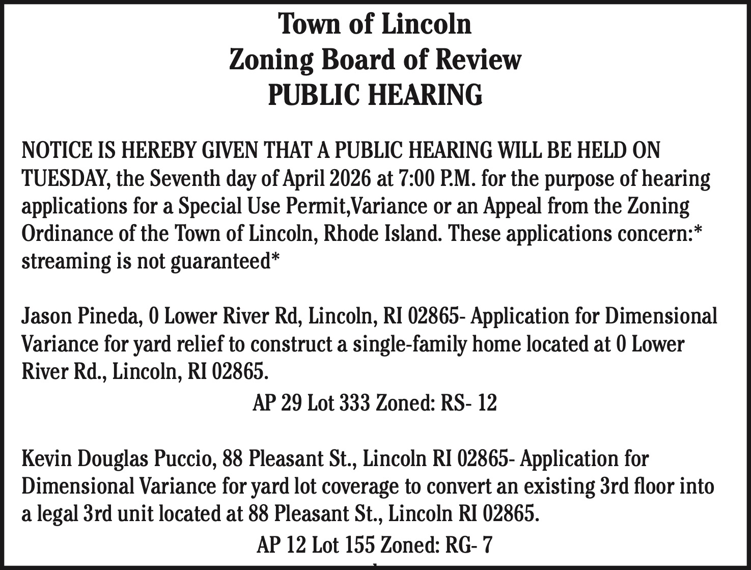 NOTICE IS HEREBY GIVEN THAT A PUBLIC HEARING WILL BE HELD ON TUESDAY, the Seventh day of April 2026 at 7:00 P.M. for the purpose of hearing applications for a Special Use Permit,Variance or an Appeal from the Zoning Ordinance of the Town of Lincoln, Rhode Island. These applications concern:* streaming is not guaranteed*
