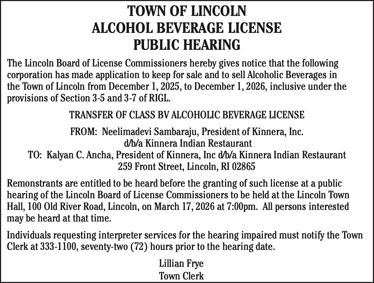 Remonstrants are entitled to be heard before the granting of such license at a public hearing of the Lincoln Board of License Commissioners to be held at the Lincoln Town Hall, 100 Old River Road, Lincoln, on March 17, 2026 at 7:00pm. All persons interested may be heard at that time.