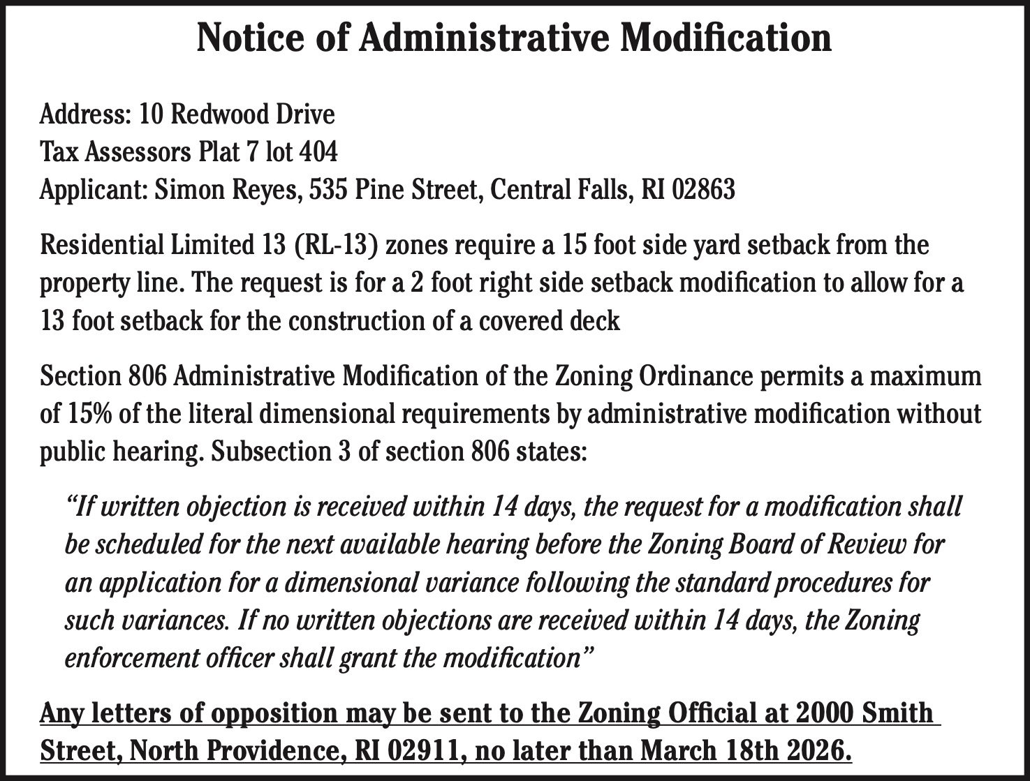 Any letters of opposition may be sent to the Zoning Official at 2000 Smith Street, North Providence, RI 02911, no later than March 18th 2026.