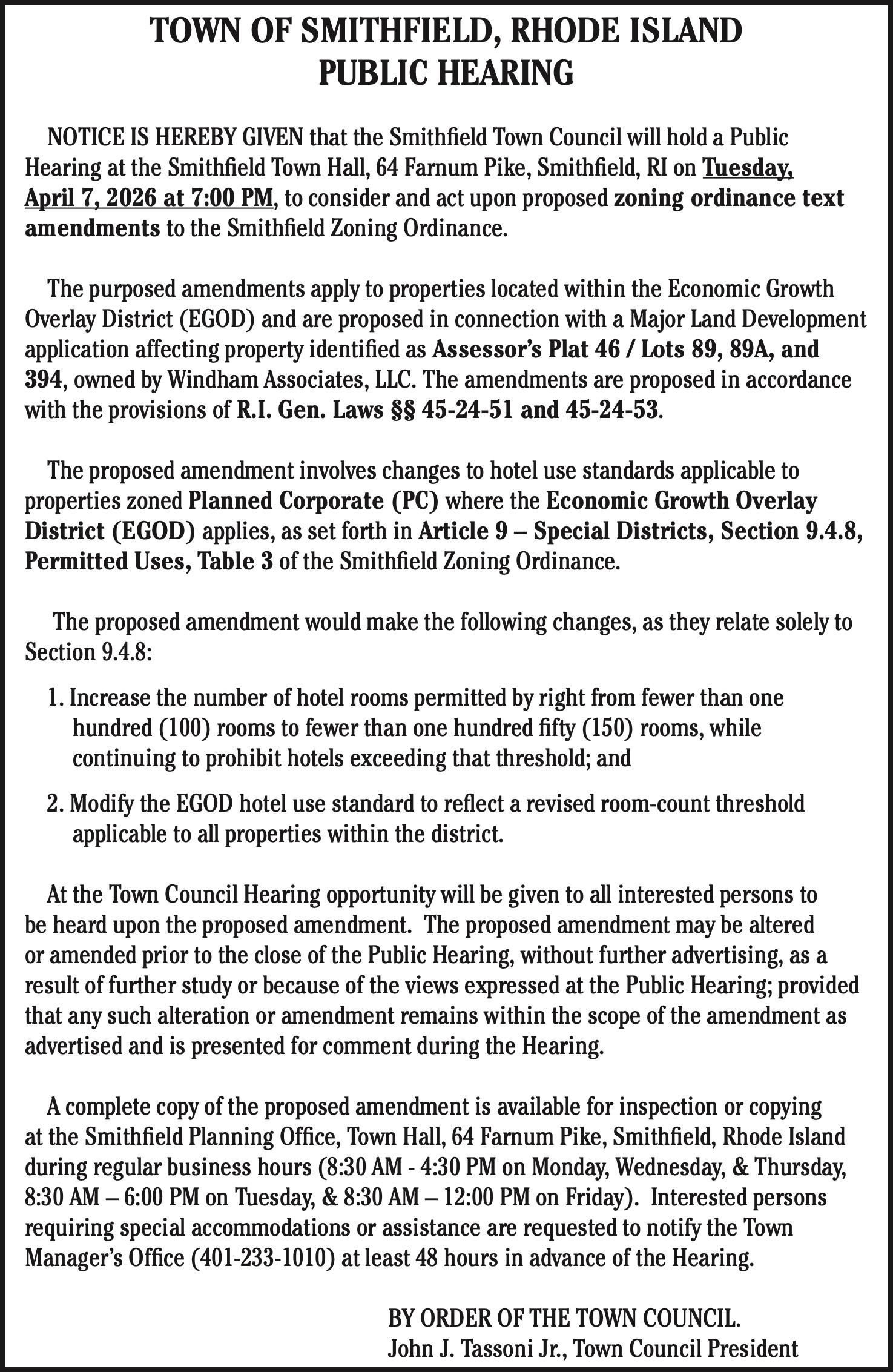 NOTICE IS HEREBY GIVEN that the Smithfield Town Council will hold a Public Hearing at the Smithfield Town Hall, 64 Farnum Pike, Smithfield, RI on Tuesday, April 7, 2026 at 7:00 PM, to consider and act upon proposed zoning ordinance text amendments to the Smithfield Zoning Ordinance.