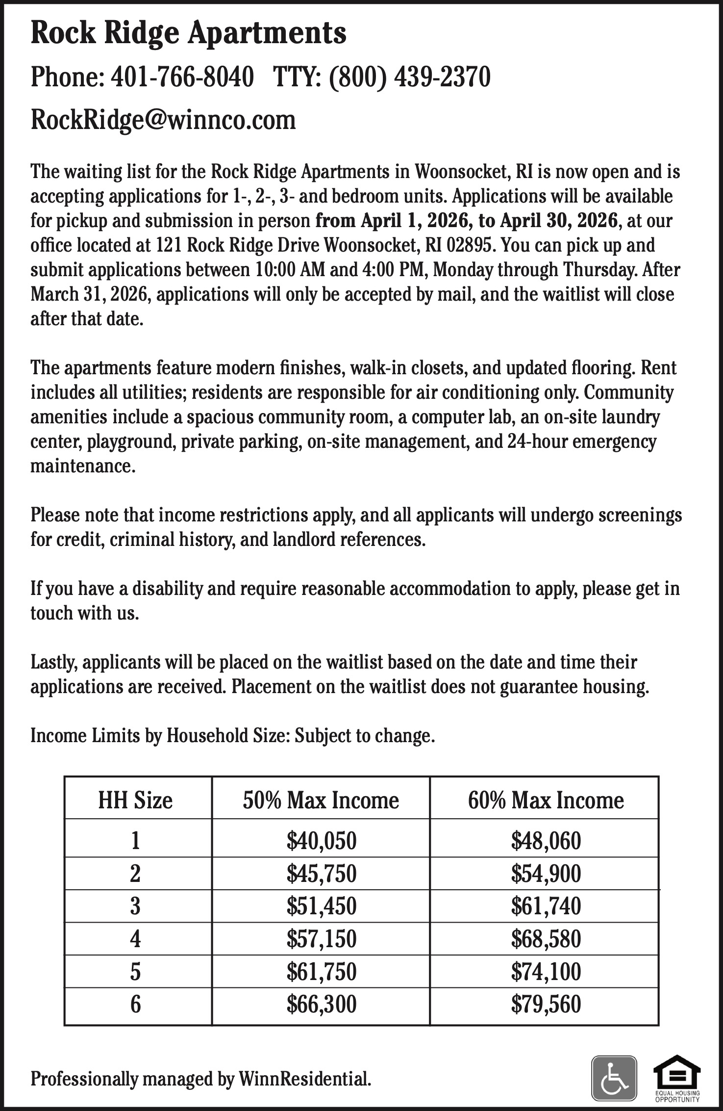 The waiting list for the Rock Ridge Apartments in Woonsocket, RI is now open and is accepting applications for 1-, 2-, 3- and bedroom units. Applications will be available for pickup and submission in person from April 1, 2026, to April 30, 2026, at our office located at 121 Rock Ridge Drive Woonsocket, RI 02895. You can pick up and submit applications between 10:00 AM and 4:00 PM, Monday through Thursday. After March 31, 2026, applications will only be accepted by mail, and the waitlist will close after that date.
