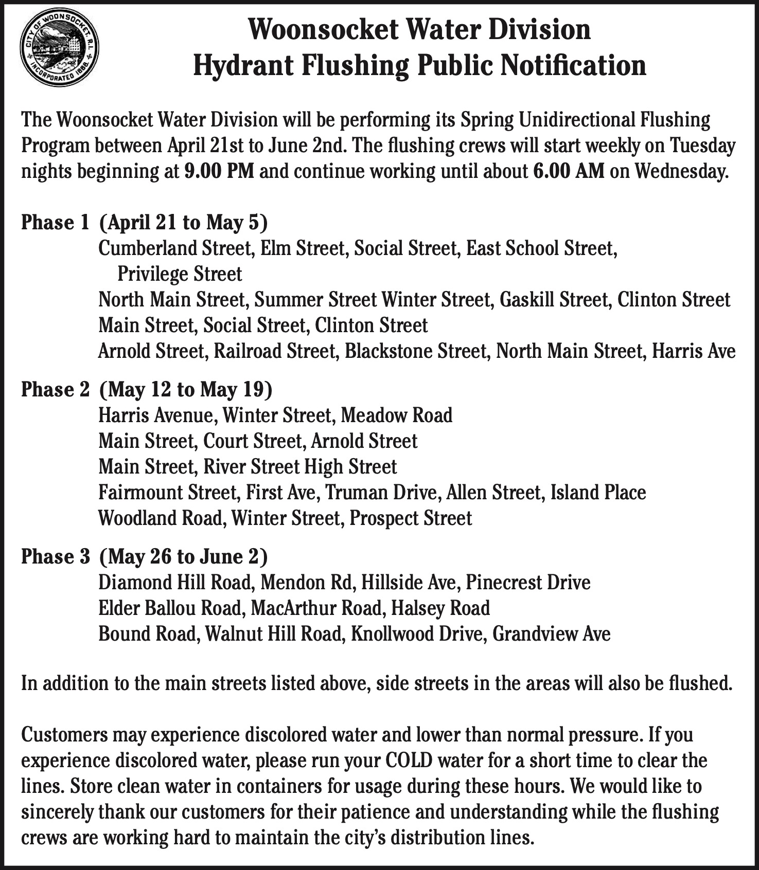 Ad textWoonsocket Water Division Woonsocket Water Division Hydrant Flushing Public Notification